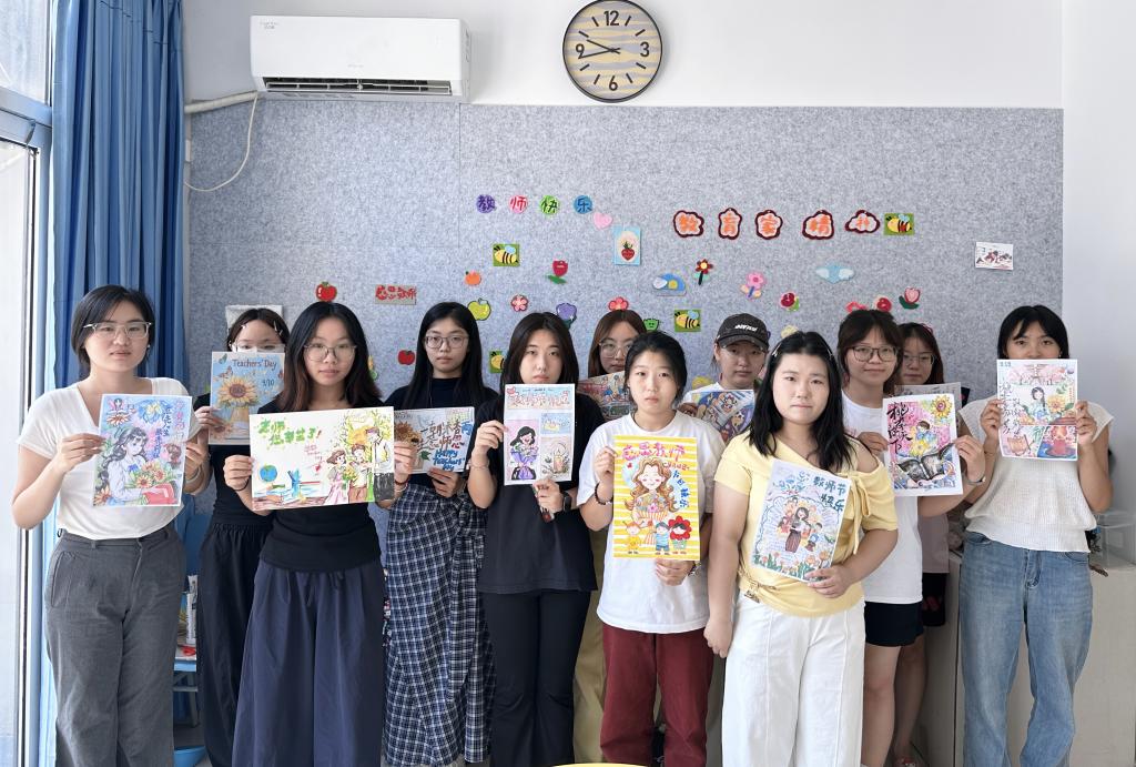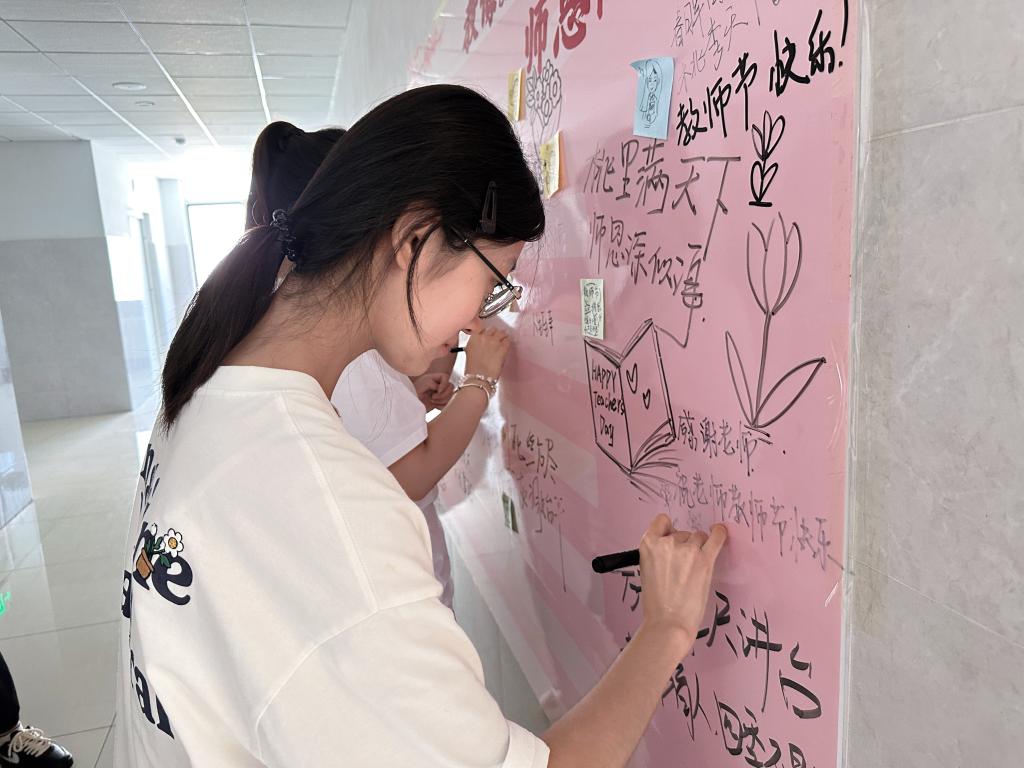 本次活动以“四个一”为主线,在教师节为老师们送上一枝花、一个书签、一张贺卡、一瓶水。同学们将这一份份满载心意的手工礼物送到教师手中,每一件礼品都融合了美院学子的巧思与专业素养,扭扭花象征永不凋谢的师恩,书签上绘有“立德树人,润物无声”等寄语,贺卡则由学生自主设计绘制并手写祝福语,一瓶清泉则寓意恩师润泽心田。温馨感人的教师节,老师们笑容洋溢,倍感欣慰。此外,在9号楼学生“一站式”社区设有“师恩涂鸦墙”,也吸引了很多同学参与,一句句“老师,您辛苦了”“祝您节日快乐”凝聚成爱的回响。