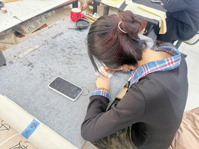 活动开始,社员们展示了精心创作的趣味印章作品,将校园地标、卡通形象、吉祥纹样等元素融入创作,瞬间拉近了篆刻艺术与学生的距离,激发了大家的参与热情。实践体验环节将活动推向高潮。在社员们的一对一细致指导下,同学们从最简单的描红打底开始,再握紧刻刀尝试冲刀、切刀等基础雕刻技法。虽然初次接触篆刻的动作略显生疏,但大家个个眼神专注、神情认真,沉浸式感受篆刻创作的独特魅力。
