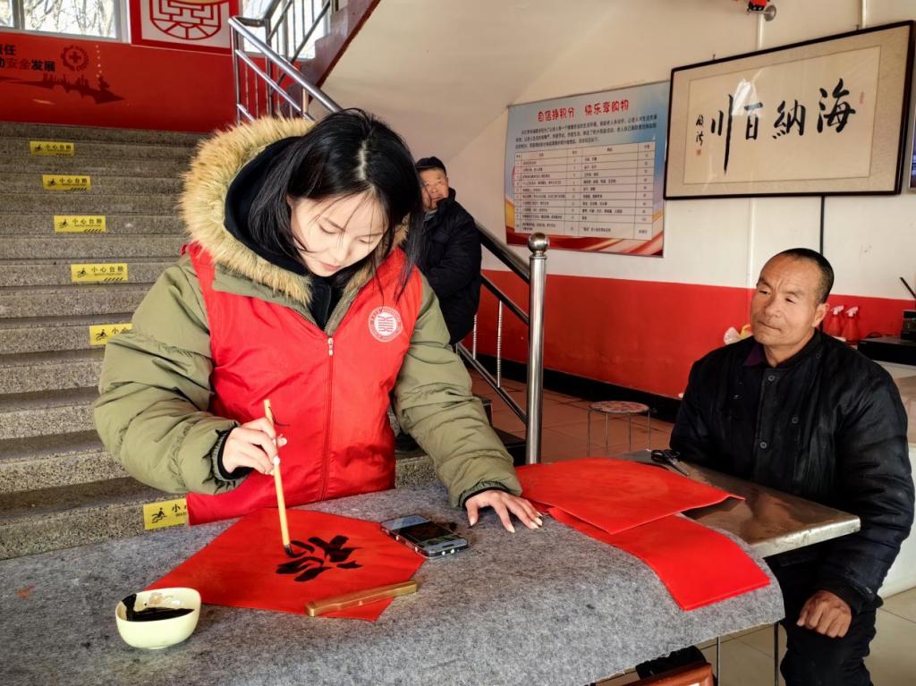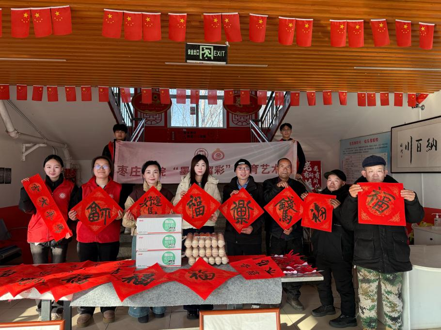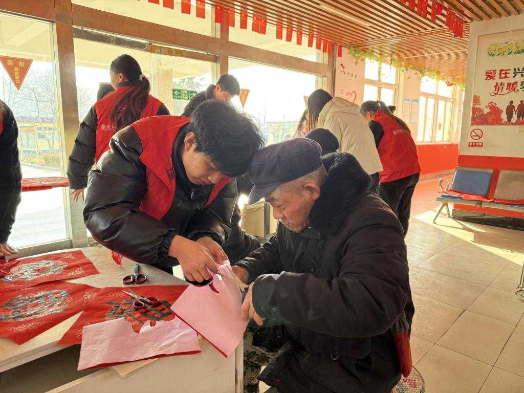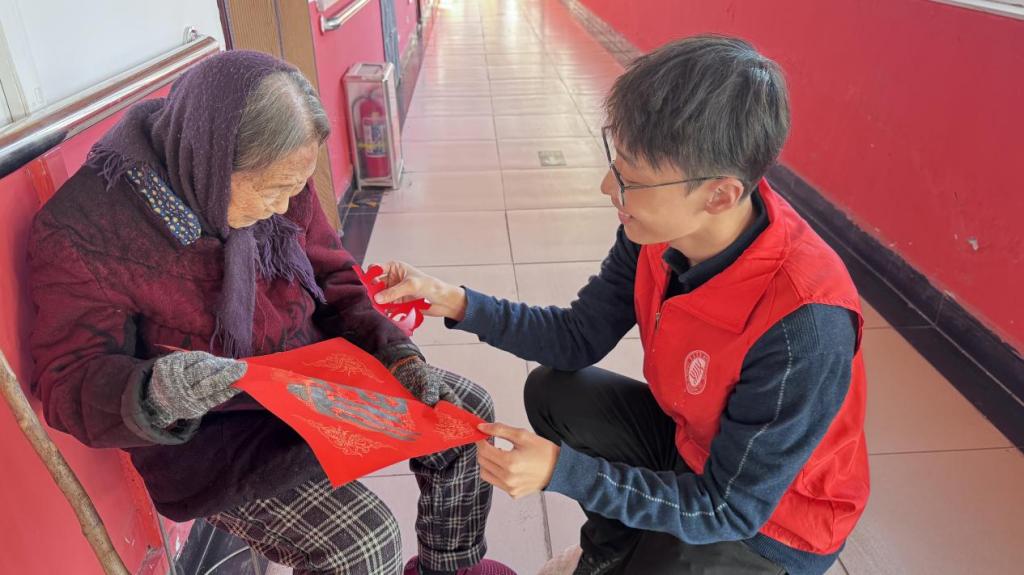 此次服务对象为敬老院23位孤寡老人。活动现场,墨香四溢、红纸翻飞。志愿者们以笔为媒,将马年“龙马精神”的吉祥寓意融入创作,写下对仗工整的春联,绘制饱满的福字。创作间隙,志愿者们以通俗易懂的语言,为老人们细致讲解楹联的平仄对仗、押韵规则等格律知识与剪纸的历史渊源、地域特色与吉祥纹样的寓意。体验环节,志愿者们手把手教老人们折红纸、定轮廓、下剪刀,现场欢声笑语不断。志愿者们还精心准备了牛奶、鸡蛋等慰问品,将创作的春联、福字和剪纸作品亲自送到老人手中。志愿者们与老人促膝谈心,关切询问饮食起居和身体状况,主动帮行动不便的老人擦拭门窗、张贴春联和窗花,现场的每一个角落都染上了新春的喜庆色彩。