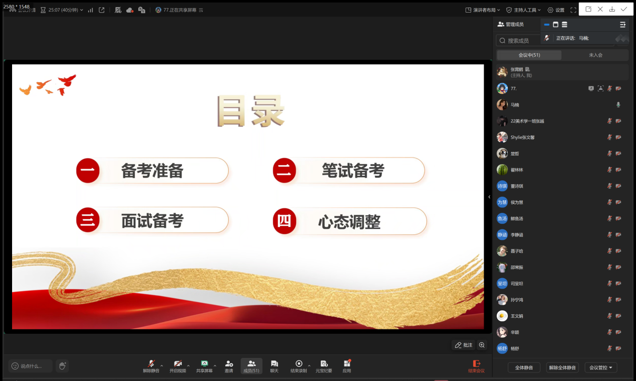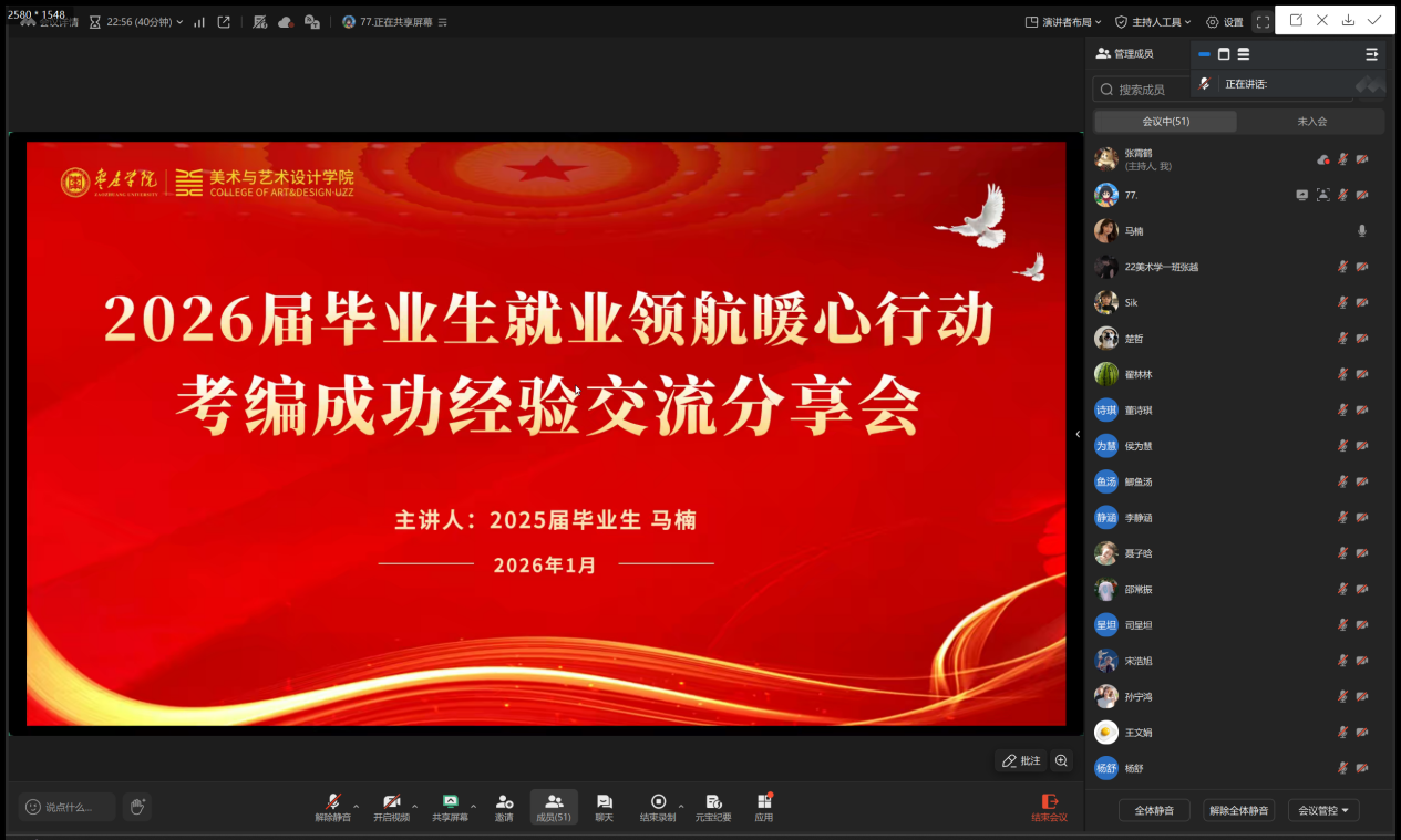 为帮助2026届毕业生明确就业方向、提升人才培养与就业质量,1月27日,365英国官网登录入口开展2026届毕业生就业领航暖心行动线上经验交流分享会。本次活动共有105名同学参加。