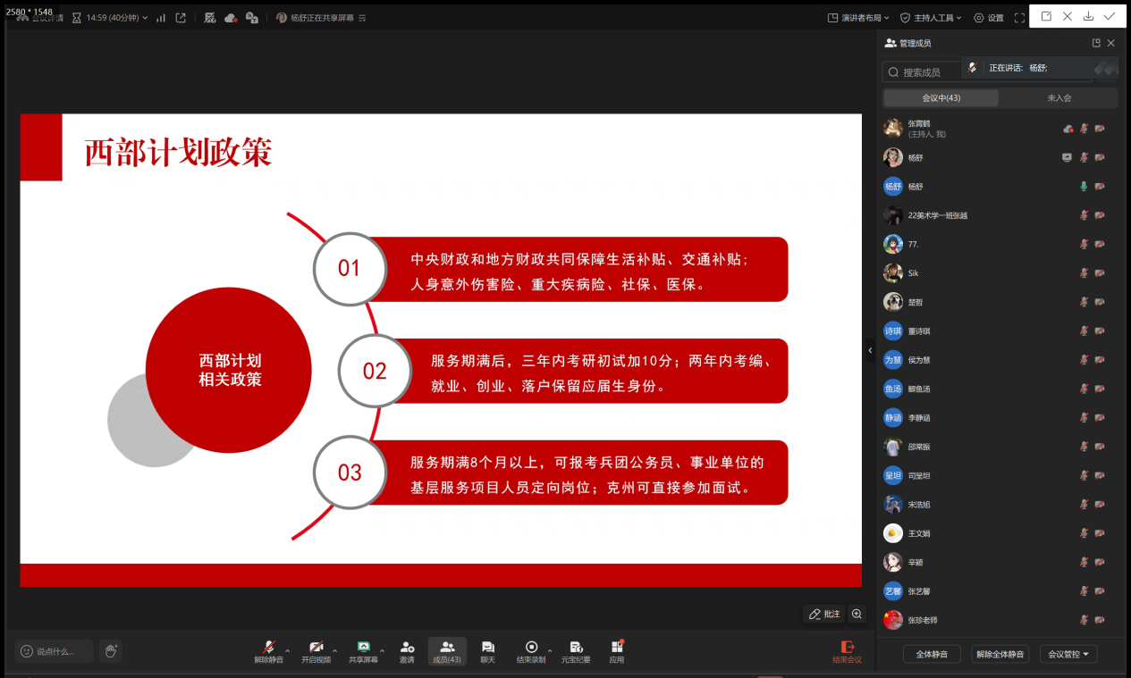 此次经验交流分享会为2026届毕业生提供了精准就业指导,强化西部计划认知、理清考编备考方向。下一步,学院将发挥深化就业领航实效,以就业需求牵引人才培养质量提升,进一步引导广大学子把个人职业理想融入国家发展大局,在时代浪潮中找准成长定位、勇担青春使命。