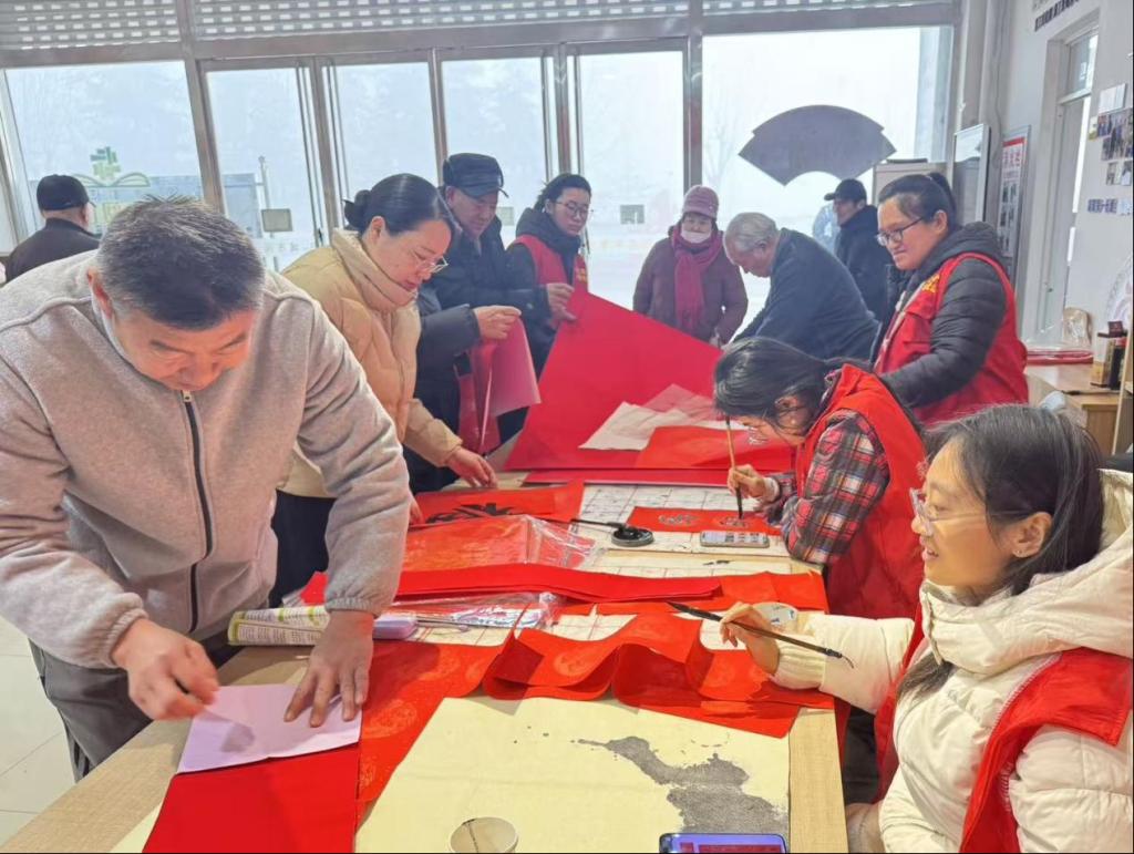 活动现场,志愿者备好笔墨纸砚、铺展红纸,书写寓意吉祥的春联与“福”字,寄寓家国安康、生活幸福的美好祝愿。现场创作之余,志愿者们还热情邀请社区居民参与传统书法创作,耐心指导社区居民握笔、运笔技巧,让其亲身感受汉字与书法艺术的独特魅力。书写完成后,志愿者们走访社区,将满载心意的春联与“福”字送到居民手中,在亲切的交流中传递新春温暖与关怀。活动尾声,志愿者们细心整理打扫场地,并与社区工作人员、居民手持春联合影留念,定格这场兼具文化气息与社区温情的美好瞬间。