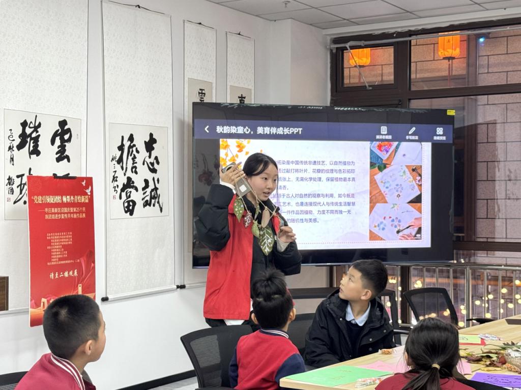 活动以“节气美学小讲堂”拉开帷幕,志愿者们根据二十四节气的时节特征,详细讲解了霜降、立冬等节气的气候特点与秋季色彩构成,引导孩子们观察秋叶的渐变色彩与形态变化。随后的“娃娃传传乐·节气小精灵共创作”环节,志愿者引导孩子们发挥想象,以霜、雾、候鸟等秋冬元素为灵感,在志愿者协助下孩子们用画笔勾勒出心中的秋冬意象,在动手实践中感受自然之美。在“拾秋入颈间,巧手做项链”环节,志愿者带领孩子们挑选形态完整的秋叶,通过修剪、穿绳、搭配小装饰等步骤,制作成独具个性的节气项链。活动尾声,志愿者介绍了植物染、彩绘纹样等非遗技艺,讲解技艺的历史渊源与制作流程,让孩子们直观感受传统工艺的智慧与魅力。