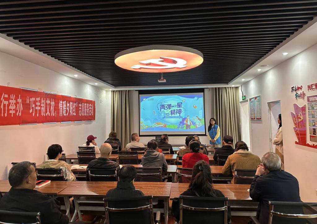 本次宣讲活动包括“理论阐释、事迹分享、互动感悟”三个环节,志愿者从“第一颗原子弹成功研制”切入,结合珍贵历史影像与感人事迹,回顾了我国核武器与人造卫星研制的艰辛历程,讲述了王淦昌、郭永怀等功勋科学家隐姓埋名、以身许国的崇高精神。宣讲结束后,开展了以“传承‘两弹一星’精神,绘就强国青春画卷”为主题的环保导弹模型和拼贴画制作活动。社区群众运用色彩与拼贴的方法将火箭、卫星及科研工作者等元素呈现于作品之中,通过亲手创作环保导弹模型,表达了对先辈功勋的崇高敬意,深化了对“两弹一星”精神的体悟。